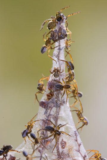 'Ballooning' is a unique method of dispersal used by several taxa of spiders. Individuals, usually young animals, climb to the top of a perch and when a breeze comes, spin a long, thin silk thread from their silk glands. The thread acts as a 'parasail' and a gust of wind will lift them up into the air and carry them away, perhaps for hundreds of kilometers. Sometimes, huge numbers of spiders will be dispersing in a given area. These pictures of ballooning spiders were taken in Autumn in the Biebrza National Park of northeast Poland, near the small city of Bialystok. They left behind enormous quantites of silk that covered the ground, a phenomenon sometimes called 'gossamer'. |