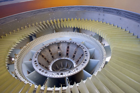 The General Electric TF-39 was an early high-bypass turbofan powering C-5A Galaxy cargo aircraft. This is the fan case for the main fan assembly at the front of the engine.