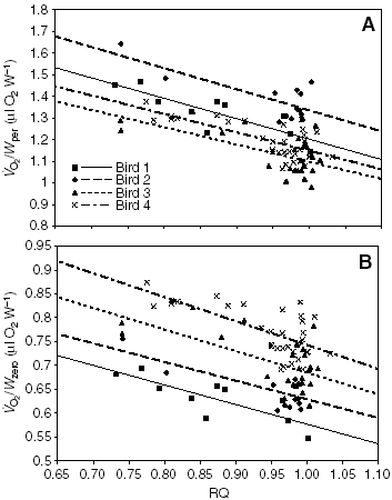 Hummingbirds, however, offer a uniquely well-suited study organism for addressing the relevance of this phenomenon to whole-animal oxygen consumption. As stated elsewhere on the website, hummingbirds predictably shift from predominantly oxidizing fatty acids when fasted, to oxidizing carbohydrates exclusively during steady-state foraging. In addition, as more than 90% of whole-animal oxygen consumption during hovering flight is accounted for by the oxygen consumption of a homogenous population of muscle fibers in the pectoral flight muscles, extrapolation of the metabolic activity of this tissue type to whole animal metabolism is comparatively simple. Further, the mechanical cost of hovering (and thus the required metabolic cost - ATP production) should be unaffected by the metabolic fuel in use, all else equal.